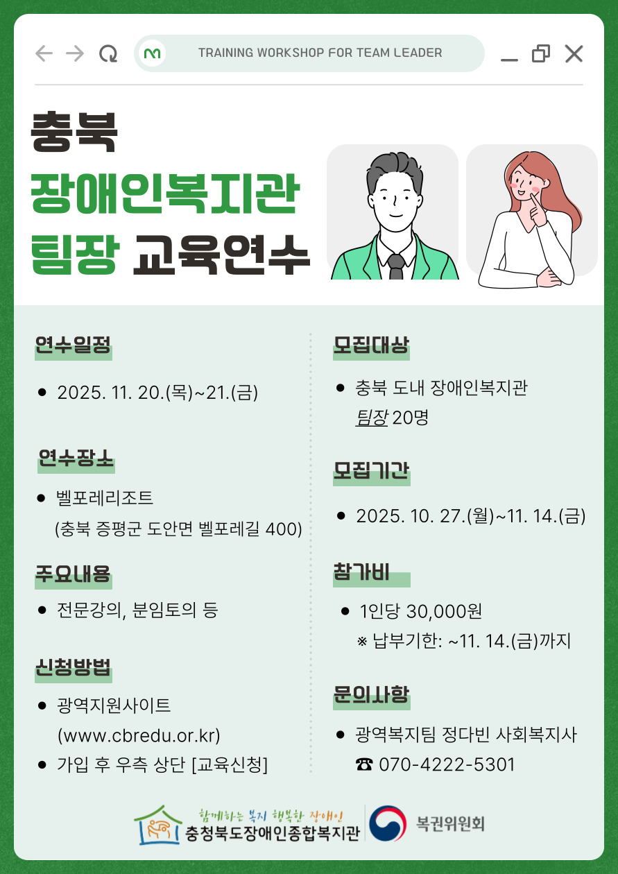 2025년 충북 장애인복지관 팀장 교육연수 참여자 모집 안내